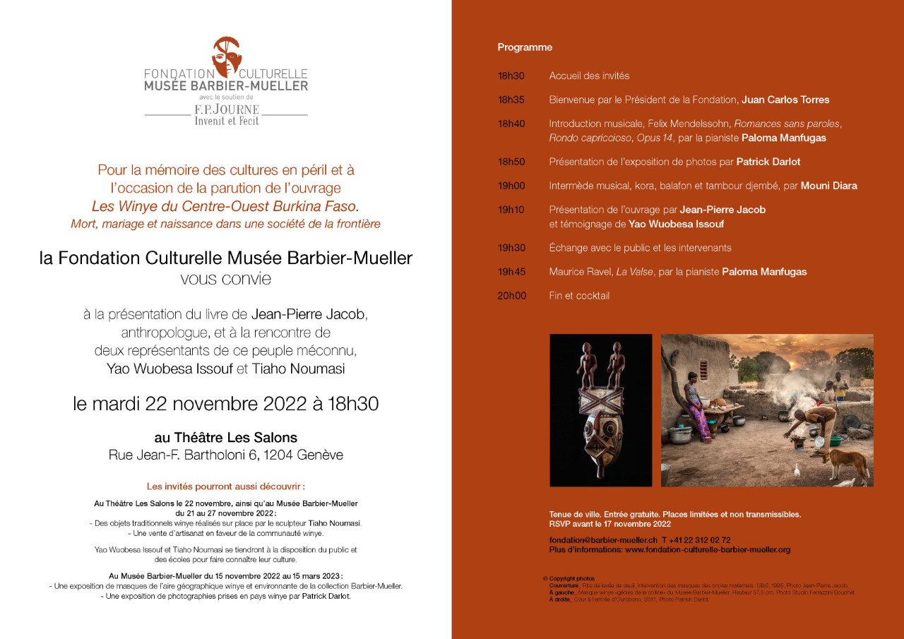 la Fondation culturelle Musée Barbier-Mueller vous convie à la présentation du livre de Jean-Pierre Jacob, anthropologue, et à la rencontre de Yao Wuobesa Issouf (enseignant) et de Tiaho Noumasi (sculpteur), représentants du peuple winye.