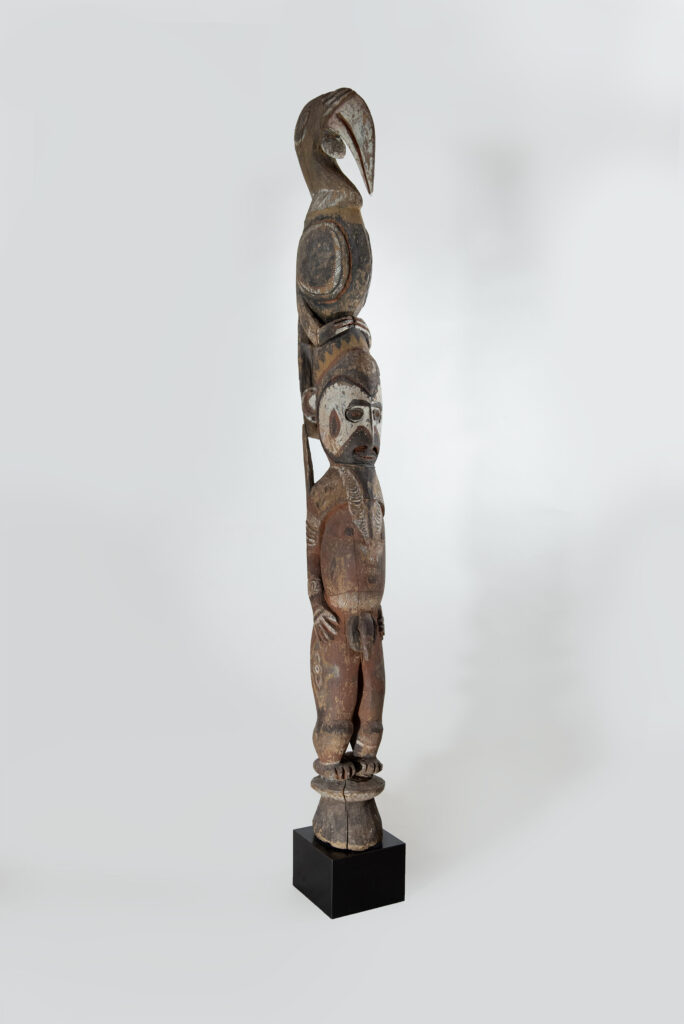 The colourful designs, as well as the indication of face paintings and body ornaments, notably the Tridacna shell rings, increased the relationship between these figures and the actual dress that these initiates would themselves wear at the end of the period of seclusion, in turn transforming them into another manifestation of these invisible procreative powers. As often the case with material representations of spirits in Melanesia, once used during these ceremonial events, images often lost their value and could become available to Western collectors. The association of anthropomorphic figures with a bird (or two birds) on the top of its head is quite a common feature throughout the area. The representation of a hornbill on the top of the head, although seemingly referring to a possible clan’s totemic bird (jaambu), seems more general.