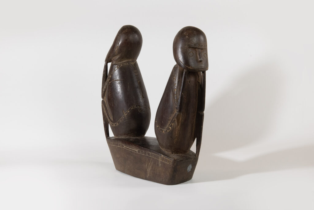 This wooden sculpture depicts two figures seated back to back on a single base. It is from the Trobriand Islands, located in the Massim area, which encompasses Milne Bay in the south-east of Papua New Guinea and the surrounding islands.