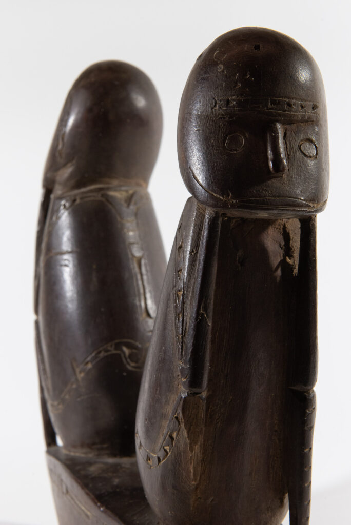 The piece is notable for the engraved curvilinear motifs adorning both the base and the figures, characteristic of the decorative style of the region. The squatting posture of the figures, elbows resting on knees, is also a typical stylistic feature of Massim art, as is the emphasis on symmetry, a recurring element in the artistic production of the cultural area. The depiction of two figures may symbolise duality, a recurrent theme in Melanesian mythology.