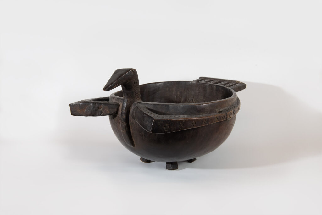 Bird-shaped wooden bowls are used on a daily basis to hold food preparations, particularly those made with starch extracted from the sago palm, a local tree that forms an essential part of the diet in the Admiralty Islands.